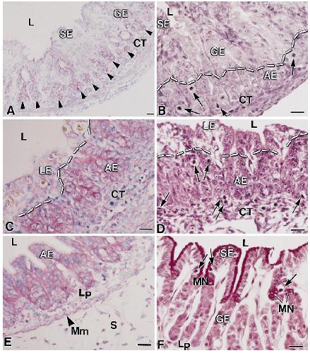 (arrows) are detected in the entire epithelium except for small