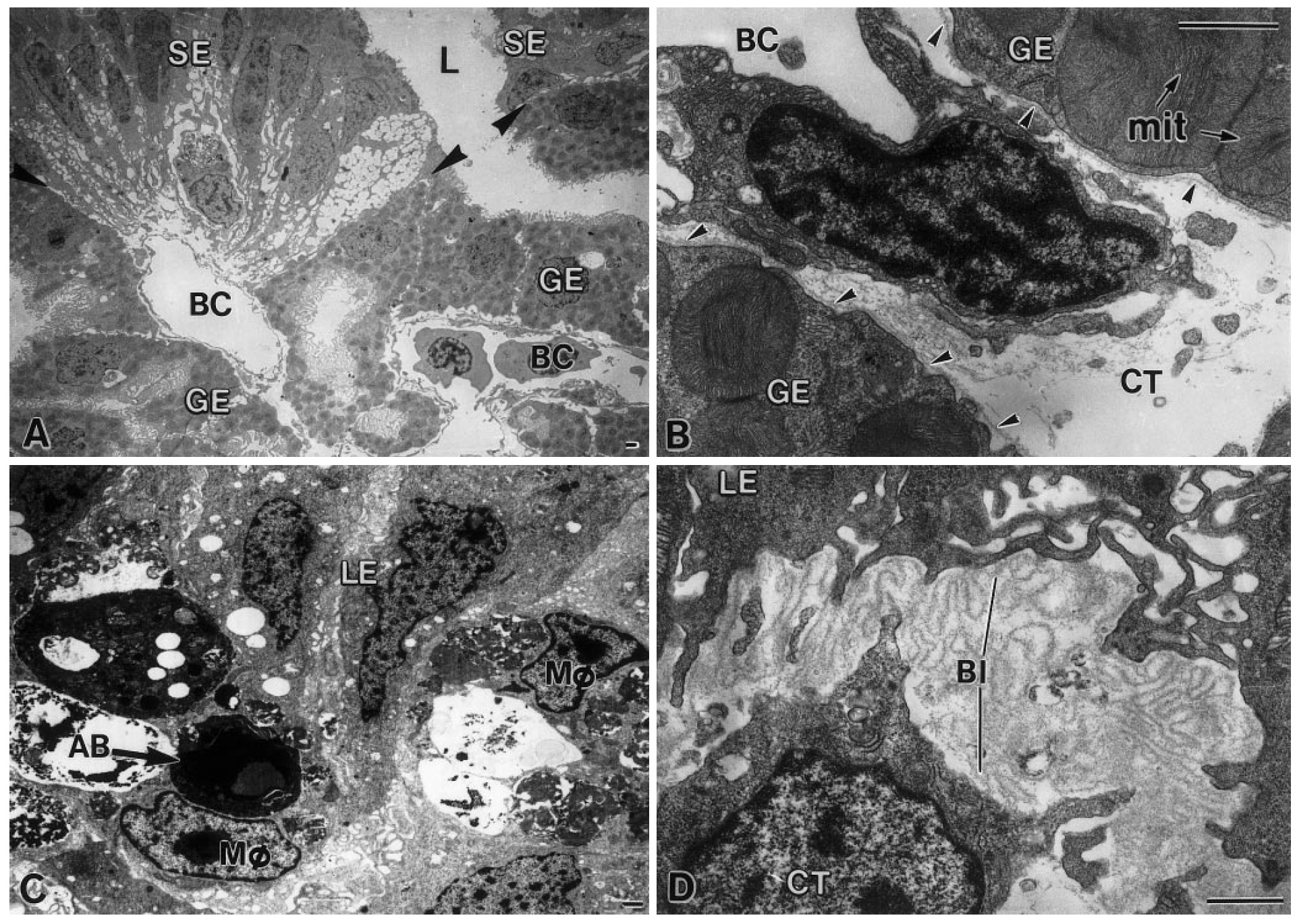 them. BC Blood capillaries, L lumen. B The thin basal lamina (arrowheads)
