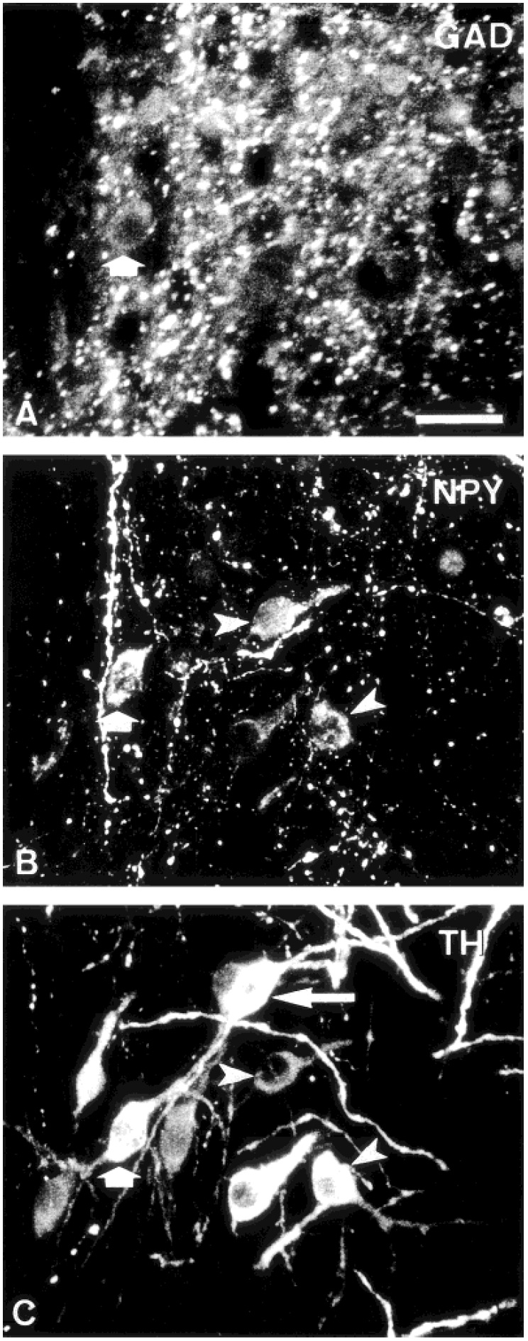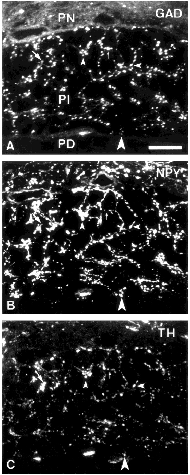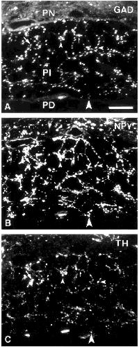 stained for NPY and TH (arrowheads), and some stain for TH only