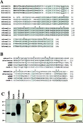 (B) Sequence alignment of the cysteine-rich domain shared by Gremlin, Cerberus, mouse DAN (mDAN), Xenopus DAN (xDAN), and C. elegans Gremlin-related-1 (ceGR-1). Conserved cysteines are marked with asterisks and shaded. Other conserved residues are shaded.