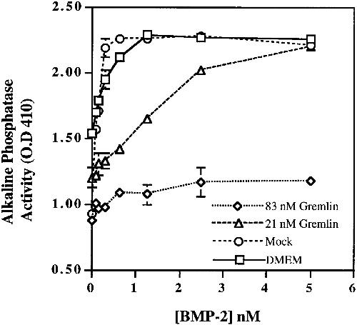 Figure 5. Gremlin Blocks the Activity of Purified BMP2. (A) Induction of alkaline phosphatase activity in W-20-17 murine bone marrow stromal cells. BMP2 at 78 pM, 156 pM, 313 pM, 625 pM, 1.25 nM, 2.5 nM, or 5 nM was preincubated with a Gremlin COS supernatant at final concentration of 83 nM or 21 nM Gremlin, mock-transfected media, or fresh DMEM prior to addition to cells. Alkaline phosphatase activity was assayed 24 hr later. â¼83 nM Gremlin completely blocks BMP2 activity. â¼21 nM Gremlin partially blocks BMP2 doses tested. |