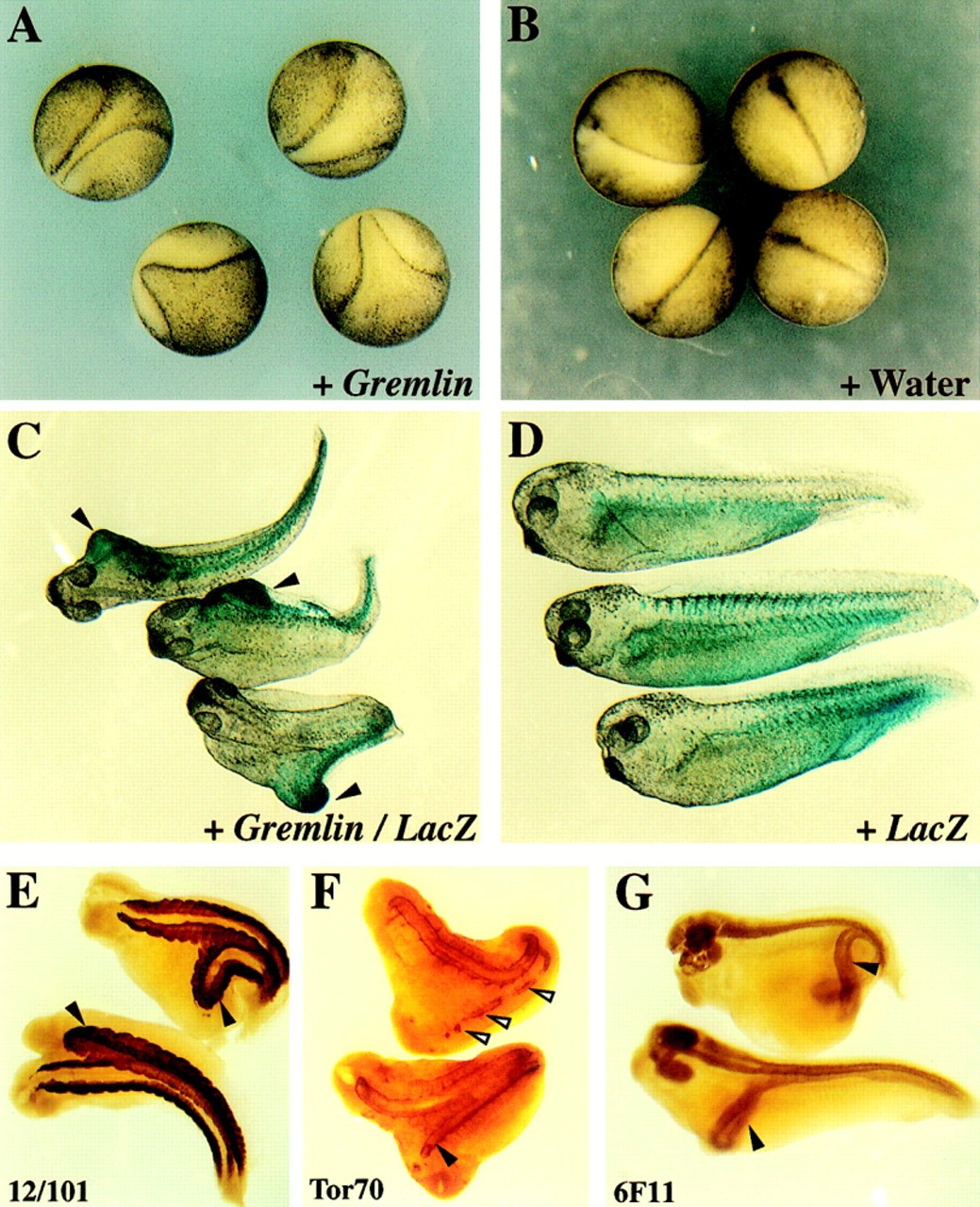 (EâG) Antibody staining with monoclonal antibodies that detect muscle (12/101), notochord (Tor70), or neural tissue (6F11) show that the composition and patterning of the Gremlin-induced axis is similar to that seen in the primary axis. Secondary axes are marked with closed arrowheads. Open arrowheads point to patches of notochord staining. |