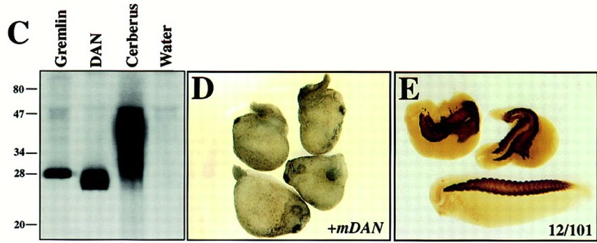 (C) DAN-family members are secreted. Oocytes were injected with 50 ng of synthetic Gremlin, DAN, or Cerberus mRNA and cultured in media containing 35S-methionine. Supernatants were analyzed by SDS–PAGE and fluorography. Gremlin and DAN expression results in accumulation of major secreted products of ∼28 kDa and ∼27 kDa, respectively. Cerberus-injected oocytes express a heterogeneous product centered around 40 kDa.