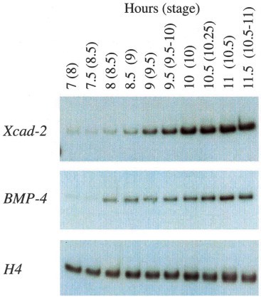 Fig. 2. The temporal pattern of expression of Xcad-2 and BMP-4. RNA samples were collected from 7 h post fertilization until 11.5 h. RT-PCR was performed with Xcad-2, BMP-4 and histone H4 specific primers. The different samples were normalized to the level of histone H4.