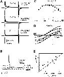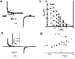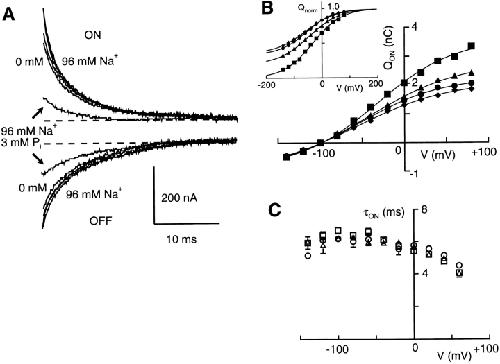 Figure 6. The effect of changing external Na+ on pre–steady state relaxations. (A) Typical response to a voltage step from −100 to 0 mV for a cell expressing NaPi-2 (Ip = −120 nA at −50 mV, 3 mM Pi). The cell was superfused with 96, 50, 25, and 0 mM Na+ and sufficient time was allowed between changing superfusate to establish a steady holding current before making pre–steady state recordings. The pre–steady state response to superfusion with 96 mM Na+ and 3 mM Pi is also shown. For superfusion with 0 mM Na+ and 3 mM Pi, the response was the same as for 0 mM Na+ alone (data not shown). All traces were blanked for the first 2 ms after the step and adjusted to give the same steady state baseline. (B) Steady state charge distribution under varying Na+. The Q-V data (ON transition) for a typical cell with superfusion with 96 (▪), 50 (▴), 25 (•), and 10 (♦) mM Na+. Continuous lines were obtained by fitting the Boltzmann function (Eq. 2) to the data. Inset shows the same data normalized to the predicted maximum charge and offset to superimpose at the depolarizing limit to indicate the shift in V0.5. (C) τ-V data pooled (n = 4) showing main ON relaxation time constant determined for superfusion with 96 (□), 50 (▵), and 25 (○) mM Na+. |