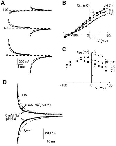 Figure 8. The effect of external pH on pre–steady state relaxations. (A) Superimposed pre–steady state relaxations for ON and OFF voltage steps to the test potentials indicated from a holding potential of −100 mV for the same cell with 96 mM Na+ in external medium. Thick traces, pH 7.4; thin traces, pH 6.2. To suppress the endogenous capacitive transient, the records were blanked for the first 3 ms after the transition. (B) Apparent charge movement for three pHs indicated in the presence of 96 mM Na+. Continuous lines are fits using the Boltzmann function (Eq. 2). The fit parameters were: (pH 7.4) z = 0.38, V0.5 = −40 mV, Qmax = 7.4 nC; (pH 6.8) z = 0.37, V0.5 = −23 mV, Qmax = 7.5 nC; (pH 6.2) z = 0.46, V0.5 = −2 mV, Qmax = 5.3 nC. (C) Voltage dependence of main ON relaxation τ for three pHs indicated and the same cell as in B. (D) Pre–steady state relaxations recorded from another cell for a step from −100 to 0 mV (ON) and returning to −100 mV (OFF) for three superfusion conditions: 96 mM Na+, pH 7.4 (thin trace); 0 mM Na+, pH 7.4, and 0 mM Na+, pH 6.2 (arrows). The graphical superposition of the traces reveals that after removal of Na+ from the external medium, a reduction in pH leads to a further suppression of the relaxations. To suppress the endogenous capacitive transient, the records are blanked for the first 3 ms after the transition. |