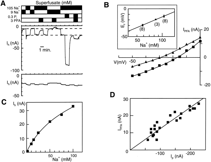 Figure 4. Characterization of Pi-independent current component using phosphonoformic acid. (A) Oocyte holding current (Ih) at Vh = −50 mV for continuous superfusion with the indicated solutions for a NaPi-2-expressing oocyte (top) and noninjected oocyte (bottom) from the same batch of oocytes and recorded during the same experimental session. Ih was sampled at 5-s intervals and the sample points have been joined by straight lines for clarity. Each superfusate combination was applied for 1 min to allow a stable baseline to be reached. Top and bottom dashed lines, superimposed on NaPi-2 data, indicate Ih at 9 and 105 mM Na+, respectively. (B) Typical I-V relations for the PFA-sensitive component at two concentrations of Na+: 109 (▪) and 59 (▴) mM. A staircase voltage protocol with 5-mV, 100-ms-long steps was applied to the oocyte. Points represent the difference between the steady state current at the end of each step under control conditions and the response in the presence of 3 mM PFA. As PFA is a trisodium salt, the control solution Na+ concentration in each case was adjusted to ensure that the Na+ gradient remained the same. Continuous lines are polynomial fits to the data, used to determine the reversal potential (Er). Inset shows Er plotted as a function of Na+ concentration. Note that Na+ concentration is plotted on a log10 scale. Number of cells is indicated for each Na+ tested. Straight line is a linear regression giving a slope 64.4 ± 1.7 mV. (C) Dose dependency with respect to Na+ for Ih in the absence of Pi at Vh = −50 mV. Data shown for a typical cell expressing NaPi-2. Each point represents the induced change in steady state current, relative to 0 mM Na+. Continuous curve is the fit using Eq. 1, giving Km = 128 mM, Ihmax = 74 nA, and n = 0.92. (D) The PFA-sensitive current correlates with the Pi-induced current. Data shown for 22 cells from several donor frogs displaying different levels of expression of NaPi-2. For each cell, the Pi-induced current (Ip) at 1 mM Pi was determined together with the PFA-sensitive component (IPFA) for 3 mM PFA at Vh = −50 mV. The straight line is a linear regression line forced through the origin with a slope: 0.126 ± 0.004. |