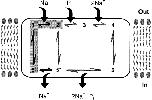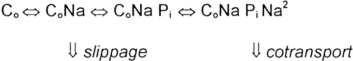 Figure 9. A state diagram representation of an ordered binding model for NaPi-2. Voltage-dependent partial reactions identified by pre–steady state experiments (translocation of the unloaded carrier, 6 ⇔ 1; binding of the first Na+, 1 ⇔ 2) are shown shaded. The empty cotransporter is assumed to have a valency of −1, but this charge translocates through a fraction of the transmembrane field to account for an apparent valency <1 derived from fits using Eq. 2. Both the slippage (2 ⇔ 5*) pathway and translocation of the fully loaded carrier (4 ⇔ 5) are assumed to be electroneutral. Depending on the availability of substrate and membrane potential, accessibility to the substrate binding sites favors either the cis (states 1, 2, 3, 4) or trans (states 5, 5*, 6) side of the membrane. Under normal physiological conditions with V < 0, the apparent transport cycle proceeds clockwise around the loop. For V < 0, and low internal Na+, external Na+ binding is facilitated on the cis side due to the outward translocation of −ve charge associated with transition 6 ⇔ 1. This allows one Na+ ion to move to its binding site within the transmembrane field, leading to an increasing of the affinity of the transporter for Pi (assumed to be predominantly divalent at neutral pH), which then binds (2 ⇔ 3) in a voltage-independent manner. Then follows a further voltage-independent step involving the binding of two Na+ ions (3 ⇔ 4) to give electroneutrality. The fully loaded carrier is now able to translocate (4 ⇔ 5), release substrates on the trans side, and return to state 6. A net inward charge movement of +1 electronic units occurs per cycle, which is manifested as Ip. Except for slippage, the order of binding/release of substrates on the cytosolic side cannot be determined using the intact oocyte preparation and, therefore, the cytosolic release of cotransported Pi, together with two Na+ ions, is lumped as one reaction (5 ⇔ 5*). |