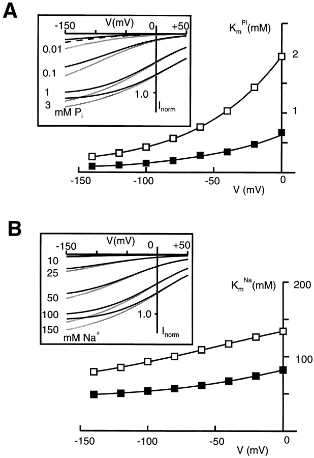 Figure 11. Simulations of Pi-induced currents in the steady state, assuming zero trans conditions. Since the transition 6 ⇔ 1 is the only translocation step involving net charge movement, the steady state current is proportional to X1k16 − X6k61, where X1 and X6 are the occupancy of states 1 and 6, respectively. Voltage-dependent rate constants and parameters are given in Fig. 10. Additional rate constants for the kinetic scheme of Fig. 9 are (s−1): k23 = 1,000 [Pi], k32 = 100, k34 = 500 [Na]2, k43 = 50, k45 = k54 = 25, k55* = 10,000, k5*5 = 0, k5*6 = 10,000, k65* = 0, k25* = 2.5, k5*2 = 2.5, where [Pi] and [Na] are the concentrations of Pi and Na+, respectively (Molar). These were chosen to give reasonable predictions of the experimentally observed I-V relations. (A) Pi dose response. Inset shows a set of I-V curves for nominal Pi values indicated, normalized to Ip at −100 mV. Dashed curve is the slippage component (simulated with Pi = 0 mM), light curves represent the total simulated Pi-induced steady state current and bold curves represent the steady state response with slippage component subtracted (equivalent to the Pi-induced response measured). Eq. 1 was fit to the data to obtain the apparent KmPi as a function of V for nominal 100 (▪) and 50 (□) mM Na+. The continuous lines are for visualization only. (B) Na+ dose response. (inset) Set of I-V curves for nominal Na+ values indicated, and 1 mM nominal Pi, normalized to Ip at −100 mV. Light curves represent the simulated total steady state current, bold curves have slippage component subtracted (equivalent to the Pi-induced response measured). Eq. 1 was fit to the data to derive the apparent KmNa as a function of V for nominal 1 (▪) and 0.1 (□) mM Pi. The continuous lines are for visualization only. |