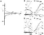 Figure 10. Simulations predict voltage-dependent behavior of pre–steady state kinetics in the absence of external Pi. Values were assigned to the parameters associated with voltage-dependent partial reactions (shown shaded in Fig. 9: unloaded carrier, 6 ⇔ 1; first Na+ binding/debinding, 1 ⇔ 2) to give a reasonable match to the measured τ-V and Q-V data under varying external Na+. (A) Simulations of pre–steady state current showing the ON and OFF relaxations for a step from −100 to 0 mV for two external Na+ concentrations (continuous lines, 100 mM; broken lines, 50 mM). The voltage step is assumed to occur instantaneously so that no account is taken of the speed of oocyte membrane charging. Note that because of the voltage dependence of k21, the fast component in the relaxation appears more prominent in the ON than OFF traces for both Na+, and this can lead to significant errors in estimating QON and QOFF (see discussion). Rate constants for voltage dependent steps are (s−1): k61 = 60 exp(−0.16 eV/kT), k16 = 120 exp(0.24 eV/kT), k12 = 8,000 [Na] exp(−0.15 eV/ kT), k21 = 2,000 exp(0.15 eV/kT), where [Na] = Na+ concentration (Molar). The corresponding valences and asymmetry factors are: z61 = 0.4, z12 = 0.5, δ61 = 0.4, δ12 = 0.5. Ordinate scale is in electronic units (eu) s−1, where 1 eu = 1.602 × 10−19 C. (B) Simulated τ-V relations for two external Na+ concentrations as in A. Bold curves represent the two nonzero time constants predicted from the eigenvalue solutions of the three-state model involving transitions 6 ⇔ 1 and 1 ⇔ 2 (continuous curves, 100 mM; broken curves, 50 mM). The faster component with τ < 1 ms would not be detected easily by curve fitting due to the oocyte charging transient. Light curves represent the voltage dependence of the reciprocal rate constants for the transitions indicated by the respective subscripts. Note that only k12 is dependent on Na+. (C) Simulated steady state Q-V relation for the same two Na+ concentrations. The amount of charge in electronic units contributed by the two transitions is shown (Q61, Q12), together with the total charge (Qt). For the simulation, the holding potential was set at −1,000 mV to obtain normalized relations. Fitting Eq. 2 to the Qt-V data predicted z = 0.5 and a shift of −16 mV for a change in Na+ from 100 to 50 mM. (D) Simulation of the effect of pH on pre–steady state kinetics. The unloaded carrier backward rate constant (K16) is assumed to be decreased from 120 to 60 s−1, resulting from an increase in external H+ as indicated by measurements. The τ-V curves predict an increase of the slower relaxation for V > 0. Continuous lines represent τs (bold) and inverse rate constants (light) under normal (pH 7.4) conditions. Broken lines are for reduced pH conditions. (E) The corresponding steady state Q-V relations for the same change in rate constant K16 showing the shift in the Q-V distribution towards depolarizing potentials (broken lines) resulting primarily from a shift in the steady state charge distribution of the unloaded carrier. |