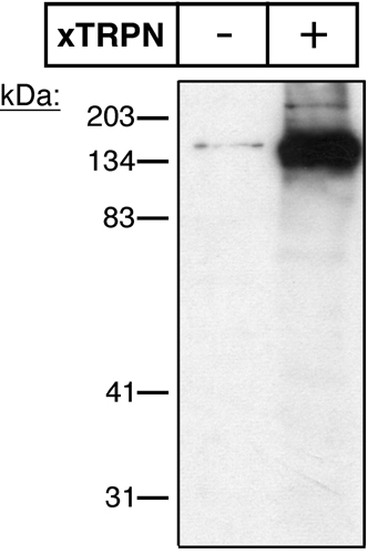 Fig. 6. Immunoblot analysis of xlTRPN1. Immunoblot with the antibody against the C terminus of xlTRPN1. Left lane, uninjected oocytes. Right lane, oocytes injected with cRNA coding for full-length xlTRPN1 (two oocytes per lane). Note the presence of xlTRPN1 in uninjected oocytes. |