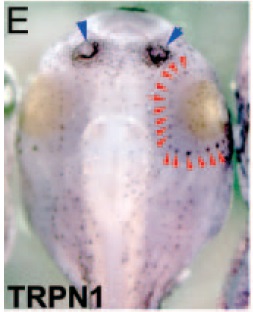 unnamed (putative transient receptor potential channel) (prospective names include NOMPC or TRPN1) gene expression in Xenopus laevis embryo, assayed via immunohistochemistry, NF stage 45, dorsal view, anterior up. |