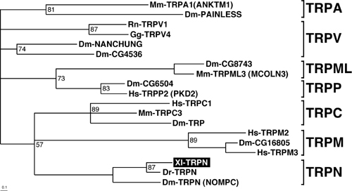Fig. 5. Evolutionary relationship of xlTRPN1 to other TRP channels. TRPN1 channels were aligned with members of each of the TRPA, TRPC, TRPM, TRPML, TRPP, and TRPV subfamilies from Drosophila and various vertebrate species. Only transmembrane domains S4-S6 of each protein were aligned. The alignment was done with CLUSTALX, and the phylogram was established by maximum-likelihood analysis using the software TREE-PUZZLE. The tree was then rooted in TREE-VIEW with TRPA and PAINLESS as an outgroup. Support values of internal branches that were <90% are indicated. Length of the branches indicates evolutionary distance. The following cDNAs or genes were used for the alignment: Mm-ANKTM1 (GenBank accession no. AY231177, amino acids aligned: 835-963); Dm-PAINLESS (GenBank accession no. AY268106, amino acids: 588-734); Rn-TRPV1 (GenBank accession no. AF029310, amino acids: 537-682); Gg-TRPV4 (GenBank accession no. AF261883, amino acids: 561-704); Dm-NAN (GenBank accession no. AY262004, amino acids: 582-718); Dm-CG4536 (GenBank accession no. CG4536, amino acids: 543-675); Dm-CG8743 (GenBank accession no. CG8743, amino acids: 442-569); Mm-TRPML3 (GenBank accession no. AY083531, amino acids: 374-501); Hs-Dm-CG6504 (GenBank accession no. CG6504; amino acids: 648-769); Hs-TRPP2 (GenBank accession no. U50928; amino acids: 559-680); TRPC1 (GenBank accession no. X89066; amino acids: 465-611); Mm-TRPC3 (GenBank accession no. AF190645; amino acids: 527-658); Dm-TRP (GenBank accession no. M34393; amino acids: 508-661); Hs-TRPM2 (GenBank accession no. AB001535, amino acids: 896-1048); Dm-CG16805 (GenBank accession no. CG16805; amino acids: 922-1056); Hs-TRPM3 (GenBank accession no. AJ505026; amino acids: 772-808 and 970-1112); Xl-TRPN (amino acids: 1249-1394); Dr-TRPN1 (amino acids: 1331-1468); Dm-TRPN1 (amino acids: 1402-1557). Dm, Drosophila melanogaster; Dr, Danio rerio; Hs, Homo sapiens; Mm, Mus musculus; Rn, Rattus norvegicus; Gg, Gallus gallus. |