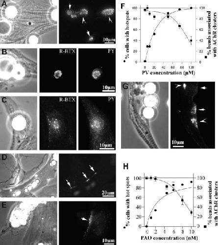 Figure 4. Effect of PTPase inhibitors on AChR cluster dispersal and formation. (A) PV at 50 μM prevented the dispersal of hot spots (two-tailed arrowheads) on a bead-stimulated muscle cell. This image was taken 24 h after bead treatment. Both bead-induced clusters (arrows) and hot spots coexisted. (B and C) Effect of PV on the formation of bead-induced clusters. AChRs, as well as phosphotyrosine labeling, were discretely concentrated at the site of bead stimulation in the control (B). PV (50 μM) caused AChR and phosphotyrosine cluster to assume a more scattered appearance (C). Small punctate aggregates were seen over a broad area around the bead. (D and E) PV effect on NMJ formation. AChR clusters form discretely at nerve–muscle contacts in the control (D). Clusters appeared more scattered in the presence of PV at 50 μM (E). Nerve–muscle contacts are shown in phase contrast on the left of each example. (F) Dose dependence of the PV effect on bead-induced cluster formation and dispersal. At 50 μM, PV nearly abolished the dispersal without significantly affecting the cluster formation. At higher concentrations, discrete clusters failed to form in the presence of pervanadate. The equation for fitting the hot spot data is described in the text. The data on bead-induced clustering were fitted with the equation: N = Nmax/(1 + exp[0.06{[PV] − 90}]), where Nmax and N are the percentage of beads with AChR clusters at 0 and a given PV concentration, respectively, and [PV] is the PV concentration. The curves are normalized to the control. (G) Effect of PAO (10 nM) on preserving hot spots. Both new clusters induced by beads (arrows) and preexisting hot spots (two-tailed arrowheads) coexist. Bead-induced clusters also assume a diffuse appearance under PAO treatment. (H) Dose-response of PAO effects on AChR formation and dispersal. The equation for fitting the hot spot data is the same as that for PV (F). The data on bead-induced clustering were fitted with the equation: N = Nmax/(1 + exp[0.56{[PAO] − 8.395}]).