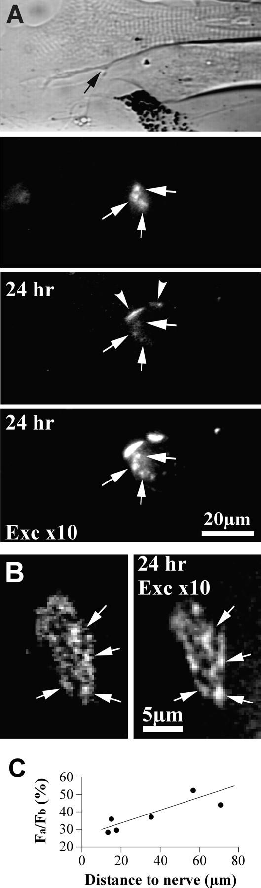 Figure 3. Innervation-induced hot spot dispersal. (A) Top panel: phase contrast; second panel: time zero of observation period (after overnight nerve–muscle coculture); third panel: 24 h after observation started; fourth panel: the same 24-h image visualized with a 10-fold increase in excitation light intensity. On this innervated muscle cell (bottom cell in the top panel), the motor nerve (arrow) induced the formation of an AChR cluster at nerve–muscle contact (arrowheads in the third panel, 24 h) and a preexisting hot spot (arrows in 2nd to 4th panels) was undergoing dispersal. After 24 h, features of the dispersing hot spot were still conserved as pointed out by arrows. (B) Fine structure of a hot spot undergoing nerve-induced dispersal. Well-preserved structural features are pointed out by arrows. The 24 h image was taken with 10× excitation. (C) Change in hot spot intensity as a function of its distance to nerve–muscle contact. Fa and Fb, fluorescence intensity of hot spots (after background subtraction) at 0 and 24 h of observation period. A linear regression line is drawn through the data points. The correlation is significant with a correlation coefficient of 0.84 (P < 0.05, Pearson product moment correlation test).