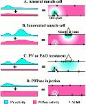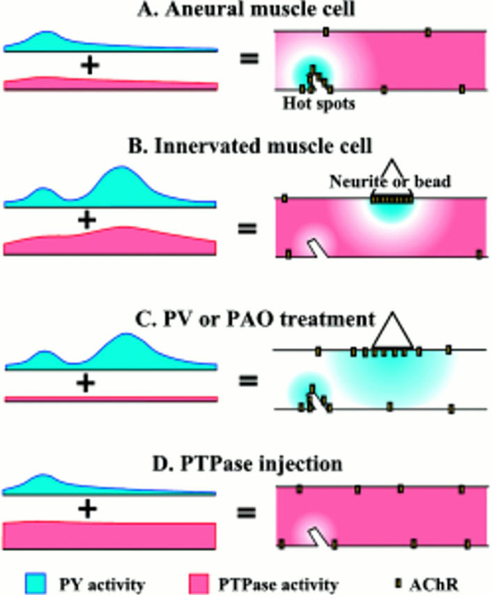 Figure 6. A model for PTPase in AChR cluster formation and dispersal. (A) In the absence of innervation, AChRs form clusters spontaneously. These sites are usually associated with phosphotyrosine concentration. The left side shows the level of either kinase activity (blue) or PTPase activity (red). The right side shows a lateral profile of the muscle cell. (B) Innervation or growth factor–coated bead locally activates receptor tyrosine kinases at the site of stimulation and also raises the PTPase activity in a diffuse manner. This results in AChR clustering discretely at the site of stimulation and the dispersal of AChR hot spots distally. (C) Inhibition of PTPase activity by pervanadate causes the diffusion of the kinase signal, resulting in more diffuse clustering process at the site of stimulation, and the retention of AChR hot spots. (D) Injection of exogenous PTPase raises the activity of this enzyme throughout the muscle cell and causes hot spot dispersal in the absence of synaptogenic stimulus.