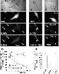 Figure 2. Dispersal of AChR hot spots as a function of distance to its nearest bead-induced new cluster. (A) Two hot spots at positions a and b underwent dispersal in response to bead-induced new cluster formation. The arrows point to two bead-induced clusters which were nearest to these two spots. Hot spot a is closer to a developing bead-induced cluster (top arrow) than hot spot b (bottom arrow). As the time sequence shows, a is dispersed at a much faster rate than b. The image at 24 h was contrast-enhanced to illustrate the bead-induced cluster (arrows). The same is true of the last time point in C and D. (B) Quantification of hot spot dispersal. Two hot spots on the same cell, one at a distance of 20 μm (squares) and the other at 30 μm (circles) away from its nearest bead-induced cluster, were recorded throughout the dispersal process. Triangles were measurements of a hot spot from a control cell not treated with beads. Points of each dispersal process can be well fitted with a simple exponential decay curve: I(t) = I0e−t/τ, where I(t) and I0 are intensities at time t and 0, respectively, and τ is the time constant. This allows the calculation of the dispersal time constant. (C) A hot spot (a) immediately underneath a bead. It underwent dispersal quickly while new clusters formed under beads (arrows). (D) A hot spot (b) at a long distance (190 μm) from the closest bead. It showed very slow decrease in R-BTX fluorescence. Its intensity at 25 h was not much different from a control cluster (a). (E) Rate of dispersal of the two hot spots depicted in C (D = 0 mm) and D (D = 190 mm). The intermediate hot spot is from another cell. (F) Time constants of hot spot dispersal as a function of distance to nearest bead-induced AChR cluster. Each dot represents a single hot spot. Data were collected from 12 cells. A linear regression line is drawn through the data points. The correlation is highly significant with a correlation coefficient of 0.87 (P < 0.0001, Pearson product moment correlation test).