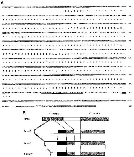 FIG. 1. Structure of XSmad7. (A) Nucleotide and deduced amino acid sequence of XSmad7. The underlined nucleotides are identical to
