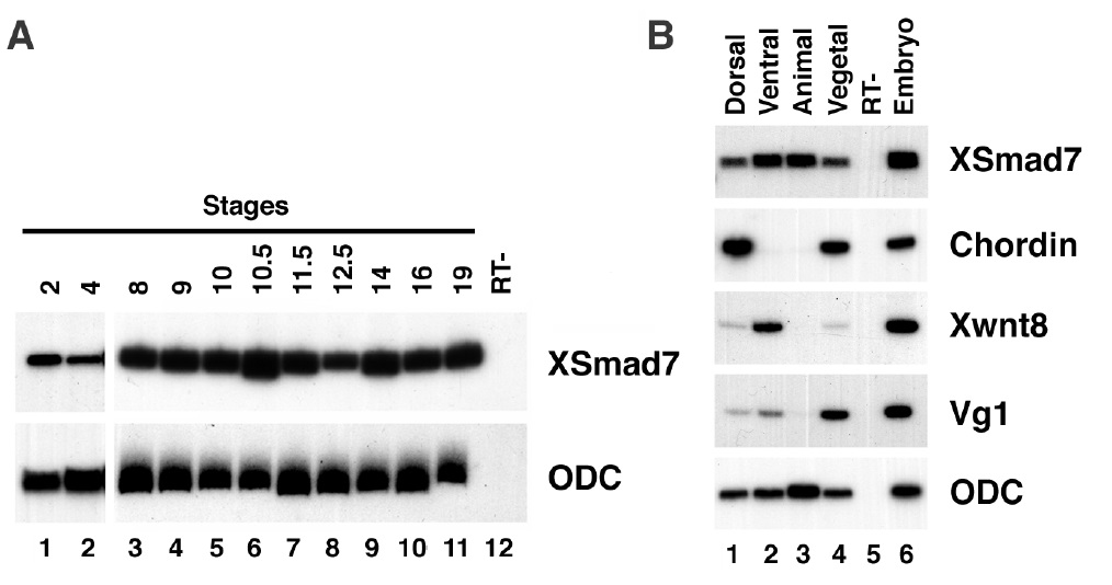 was harvested. The RNA was analyzed by RT-PCR for the distribution of Xsmad7 in different regions of the embryo. Vg1, chordin, and