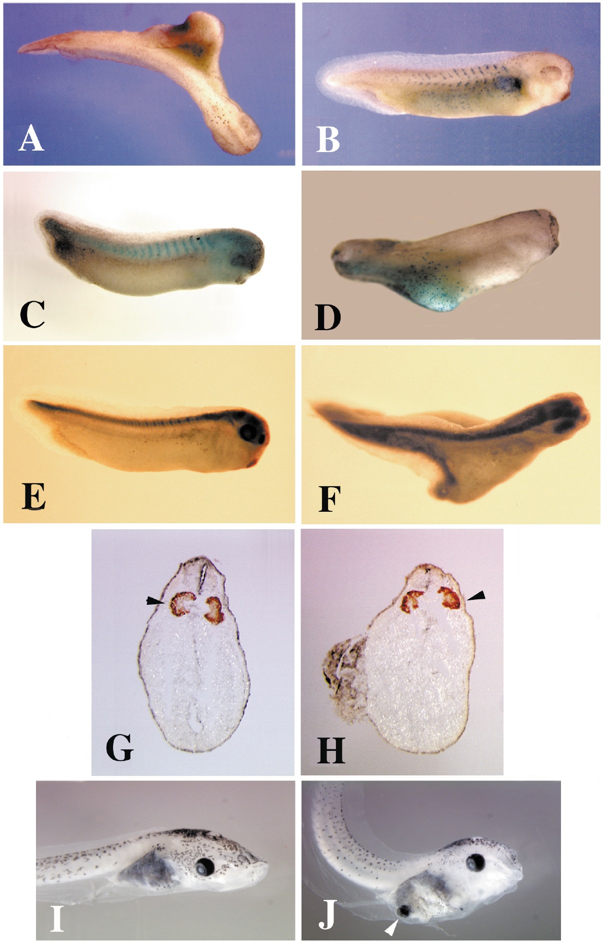 [arrowheads, G (control) and H (ventral injection)], this expression is absent in the secondary axis (H and data not shown). Animal pole