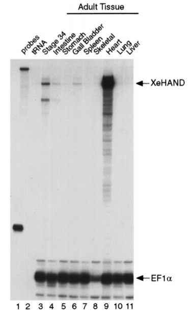 Fig. 6. Expression of XeHAND in adult frog tissues. The distribution of XeHAND mRNA in adult frog tissues was analysed by RNase protection assay. Lane 1, undigested probes; lane 2, tRNA control; lanes 3â11, tad- pole embryo (stage 34), intestine, stomach, gall bladder, spleen, skeletal, heart, lung, liver RNA, respectively. Five micrograms of total RNA was used in each assay. Full-length protected fragments for each probe are indicated. As an internal control, a probe for the highly abundant EF1-a was included in the XeHAND assay.