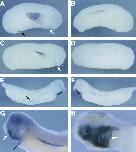 Fig. 3. Whole-mount in situ analysis of XeHAND expression. (A) Lateral view of a Xenopus tailbud embryo (stage 24). Anterior is to the right. Staining in the presumptive heart region is indicated by a white arrow, and staining in the proctodeum is indicated by a black arrow. (B) View of the same embryo from the opposite side. (C) Lateral view of an embryo at stage 27. Anterior is to the right. Staining in the presumptive heart region is indicated by a white arrow. (D) View of the same embryo from the opposite side. (E) Lateral view of a stage 32 embryo. Staining in the vitelline veins is indicated by a black arrow. (F) View of the other side of the same embryo. (G) Lateral view of a stage 33/34 embryo. Anterior is to the left. Staining in the ventral aorta and aortic arches is indicated by a white arrow, and staining in the sinus venosus (venous inflow tract) is indicated by a black arrow. Expression in the presumptive posterior cardinal veins running ventral to the somites can clearly be seen. (H) Ventral view of a stage 33/34 embryo. Overstaining reveals XeHAND expression in the heart tube (white arrow).