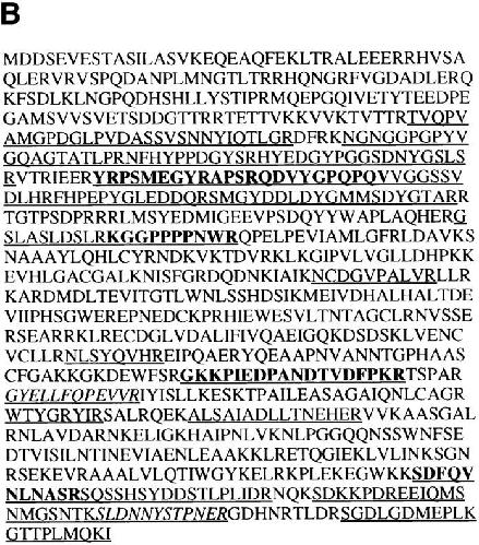 Figure 9. The 92-kD protein bound by GST-Prox is identical to p120ctn. (A) Detection of the 92-kD protein isolated from HCT116 in a large scale experiment. Coomassie brilliant blue staining of a large scale experiment isolating the 92-kD protein from HCT116 lysates using GST-Prox. Arrow marks the 92-kD protein. (B) Peptides identified in the protein sequence of p120ctn. Mass spectrometry analysis identified 27 major fragments that are underlined in the sequence. In bold are the sequences that were found in more than one peptide fragment. The two fragments that were subjected to NH2-terminal sequence analysis are shown in italics.