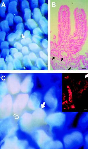 Figure 3. Villus branching in 129/Sv(ΔN89β-catenin) epithelium. (A) Wholemount preparation of the jejunum from a 6-mo-old chimeric-transgenic mouse. Arrow, branched 129/Sv villus. (B) Section from the same wholemount stained with nuclear fast red. Each limb of the branched villus is equivalent in height. There are no obvious morphologic abnormalities in the crypts associated with this villus (arrows). (C) A branched polyclonal villus. Open arrow, a stripe of β-gal–positive (blue) B6-ROSA26 epithelium in one of the branches. The other branch is wholly 129/Sv (closed arrow; white). Inset, section of the branched villus incubated with rabbit antibodies to β-gal and Cy3-conjugated donkey anti–rabbit Ig. The stripe of B6-ROSA26 epithelium in one of the branches appears red. Closed arrow, the other, β-gal–negative, 129/Sv branch. Bars: (B and C) 25 μm. |