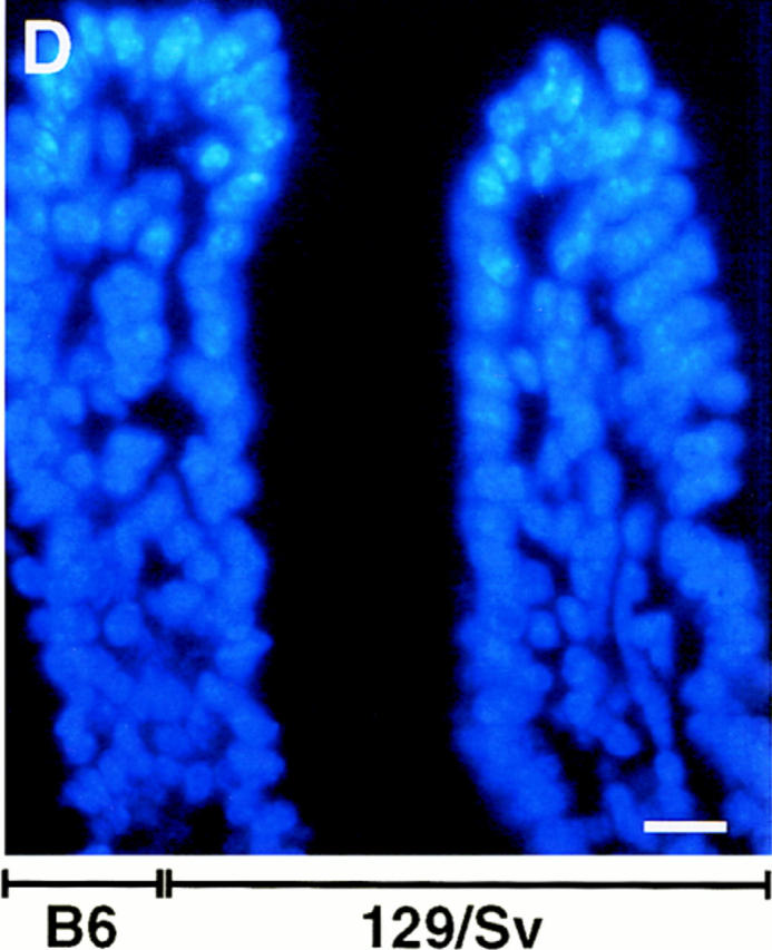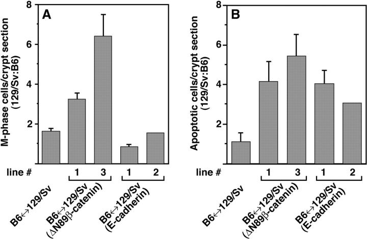 Figure 6. ΔN89β-catenin stimulates proliferation and apoptosis in 129/Sv crypts. (A) The number of M-phase cells in juxtaposed B6-ROSA26 and 129/Sv jejunal crypt sections were scored in 6-mo-old normal chimeras, in two lines of chimeric-transgenic mice generated using separate ES cell clones stably transfected with Fabpl–ΔN89β-catenin DNA, and in two lines of chimeric-transgenic mice produced from independent ES cells clones stably transfected with Fabpl-mouse E-cadherin DNA (Hermiston et al., 1996). Each mouse served as its own control: the average number of M-phase cells in their 129/Sv crypts were divided by the average number of M-phase cells in their B6-ROSA26 crypts. Mean values ±1 SD obtained from animals in each group are plotted except for line 2 of B6↔ 129/Sv (E-cadherin) chimeras where only two animals were examined. Note that the stimulation of crypt proliferation is similar in mice belonging to a given line of B6-ROSA26↔ 129/Sv(ΔN89β-catenin) chimeras. Differences between lines produced from different Fabpl–ΔN89β-catenin ES cell clones were attributed to differences in the levels of expression of this transgene. (B) Apoptotic cells were scored in jejunal sections prepared from the same animals used to define the mitotic index in A. |