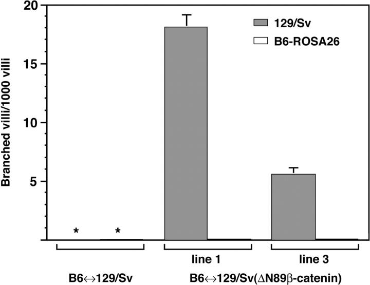 Figure 4. Quantitation of villus branching. Branching was defined and quantitated as described in Materials and Methods. Branched villi were scored in the B6-ROSA26 and 129/Sv jejunal components of 6-mo-old normal chimeras (B6-ROSA26↔ 129/ Sv) and chimeric-transgenic (B6-ROSA26↔ 129/Sv[NΔ89β-catenin]) mice. Each line of chimeric-transgenic mice was derived from an independent clone of ES cells stably transfected with Fabpl–NΔ89β-catenin DNA. Mean values ±1 SD are plotted. Asterisk, the frequency of branched villi was <0.01%. |