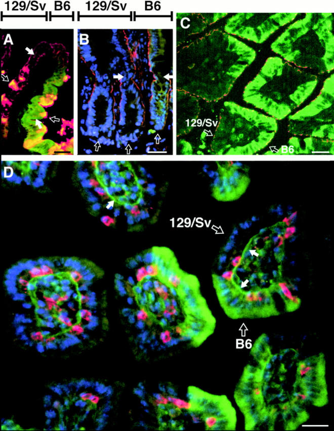 Figure 5. Forced expression of ÎN89β-catenin has no discernible effects on epithelial cell differentiation. Frozen sections were prepared from PLP-fixed jejunums of 6-mo-old chimeric-transgenic animals. (A) A polyclonal villus stained with biotin-conjugated Dolichos biflorus agglutinin (DBA), Cy3-conjugated avidin, rabbit antiâβ-gal, and FITC-conjugated donkey antiârabbit Ig. Glycoconjugates containing GalNAcα3GalNAc and GalNAcα3Gal recognized by DBA appear yellow-orange; β-gal appears green. The polarity and differentiation of enterocytes appears to be unaffected, as judged by the distribution of these glycoconjugates in apical membranes and supranuclear Golgi apparatus (closed arrow). Similarly, based on their reaction with DBA, the number and differentiation of goblet cells (open arrows) is equivalent in the 129/Sv and B6-ROSA26 components of the polyclonal villus. (B) The base of a polyclonal villus with its crypt-villus junction indicated by closed arrows. Three crypts are seen (open arrows at their base): the one on the left is supplying cells to another villus. The section was incubated with rat anti-β4 integrin subunit, Cy3 donkey antiârat Ig, rabbit antiâβ-gal, FITC donkey antiârabbit Ig, and bis-benzimide. Nuclei (blue); the β4 integrin subunit (orange); β-gal (green-brown). The location of β4 integrin at the base of epithelial cells and its distribution along the crypt-villus unit are unaffected by ÎN89β-catenin. (C) Villi sectioned perpendicular to their crypt-villus axis. The tight junction protein ZO-1 (orange) was detected with rat anti-ZO-1 and Cy3 donkey antiârat Ig. β-Gal (green) was visualized with the same reagents used in the preceding sections. The levels and location of ZO-1 in the 129/Sv(ÎN89β-catenin) and B6-ROSA26 components of polyclonal villi are similar (e.g., open arrows). (D) Villi sectioned perpendicular to their crypt-villus axis as in C. The section was incubated with rat anti-β7 integrin, Cy3-donkey antiârat Ig, rabbit anti-laminin, rabbit antiâβ-gal, FITC donkey antiârabbit Ig, and bis-benzimide. B6-ROSA26 cells exhibit diffuse staining of their cytoplasm due to the presence of β-gal (green). β7 integrin is confined to intraepithelial lymphocytes (orange). Comparable numbers of these cells are seen in the B6-ROSA26 and 129/ Sv(ÎN89β-catenin) components of polyclonal villi and in wholly 129/Sv(ÎN89β-catenin) villi. Laminin appears as linear green immunoreactivity underlying 129/Sv and B6-ROSA26 epithelium (e.g., closed arrows). The intensity of staining is similar under cells of both genotypes. Bars, 25 μm. |