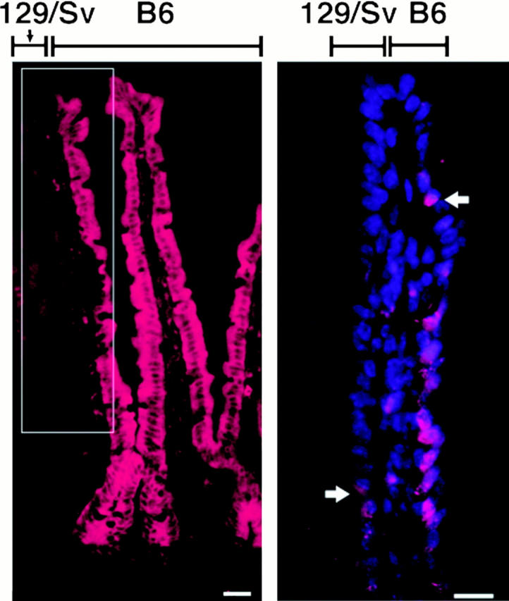 Figure 7. Forced expression of ÎN89β-catenin is associated with a slowing of epithelial migration. A 6-mo-old chimeric-transgenic mouse was pulse labeled with BrdU 60 h before killing. Left, a section stained with rabbit antiâβ-gal and Cy3 donkey antiârabbit Ig. The villus encompassed by the box is polyclonal. Right, an adjacent section of the polyclonal villus, stained with goat anti-BrdU, Cy3 donkey antiâgoat Ig, and bis-benzimide. The leading edge of the column of BrdUâpositive 129/Sv(ÎN89β-catenin) epithelial cells (magenta-colored nuclei) has only reached the middle portion of the villus (arrow), whereas the leading edge of the BrdUâpositive B6-ROSA26 column is already near the villus tip. Bars, 25 μm. |