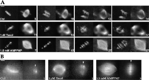 Figure 4. Pharmacological analysis of anaphase chromosome movement and poleward MT flux in Xenopus extract spindles. (A) Effect of taxol and AMPPNP treatments on chromosome movement and spindle structure during anaphase in vitro. Top row represents a control anaphase (Ctrl), the middle row represents anaphase in 1 μM taxol (1 μM Taxol), and the bottom row represents anaphase in 1.5 mM AMPPNP (1.5 mM AMPPNP). Taxol and AMPPNP were added along with the calcium used to initiate anaphase (t = 0 min). Each time point in the sequence is represented by paired DAPI-labeled chromosome (left) and X-rhodamine tubulin (right) images and the time after calcium addition is stamped in minutes on the lower right corner of the X-rhodamine tubulin image. Note both the much later times after calcium addition and the fivefold larger intervals (10 min vs. 2 min) between consecutive time points for the 1.5 mM AMPPNP sequence. The observed separation of sister chromatids in 1.5 mM AMPPNP is not due to chromosome-to-pole movement but primarily resulting from spindle elongation (see Fig. 5). (B) Effect of taxol and AMPPNP treatments on poleward MT flux. Paired X-rhodamine tubulin and fluorescein tubulin images are shown 1 min (for control and 1 μM taxol–treated spindles) and 3 min (for 1.5 mM AMPPNP–treated spindles) after the fluorescent mark was made on the spindle MTs. The initial position of the mark on the spindle is indicated by a white arrowhead. The 1 μM taxol spindle was marked 8 min after taxol addition. The 1.5 mM AMPPNP spindle was marked ∼10 min after addition of calcium and AMPPNP. Bar-splitting occurs as a result of poleward flux of MTs emanating from opposite spindle poles (Sawin and Mitchison, 1991). The similar extent of splitting of the initially central fluorescent mark is evident in both the control and taxol-treated spindles. Significant bar-splitting is not evident in the presence of 1.5 mM AMPPNP. Even at much later times (up to 10 min after marking the spindle), there is no significant bar-splitting at this AMPPNP concentration (see also Sawin and Mitchison, 1991). Bars: (A) 20 μM; (B) 10 μm.