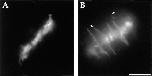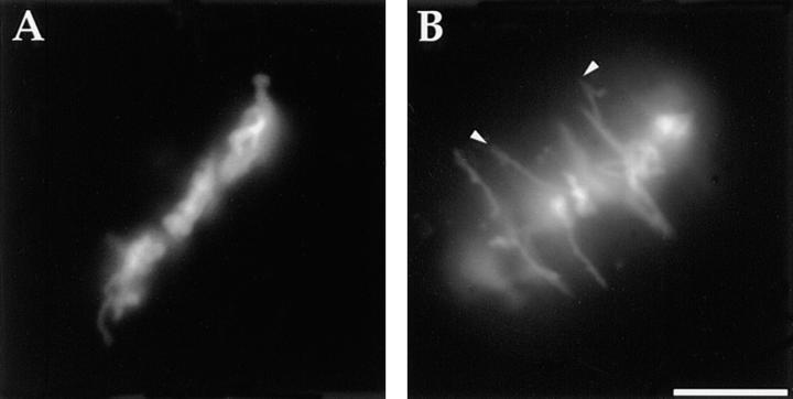 Figure 7. Morphology of chromosomes on Xenopus extract spindles in early metaphase arrest (A) and after a prolonged metaphase arrest (B). Arrowheads in B indicate the acrocentric centromere regions at the poleward edges of the partially disjoined chromosomes. This morphology was observed in experiments on several different extracts after a prolonged metaphase arrest. Bar, 10 μm.