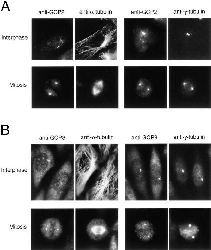 Figure 5. GCP2 and GCP3 are localized to the centrosome. (A) CHO cells were fixed and co-stained with anti-hGCP2 and either anti–α-tubulin or anti–γ-tubulin antibodies as indicated. (B) CHO cells were fixed and co-stained with anti-hGCP3 and either anti–α-tubulin or anti–γ-tubulin as indicated. Examples of cells in interphase and mitosis are shown.