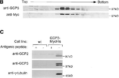 Figure 9. Epitope-tagged hGCP3 localizes to the centrosome and incorporates into the cytoplasmic γ-tubulin complex. (A) A31 cells stably expressing hGCP3MycHis were fixed and co-stained with anti-Myc and either anti–α-tubulin or anti–γ-tubulin, as indicated. Examples of both mitotic and interphase cells are shown. (B) Cell lysates made from A31-hGCP3MycHis were run on a sucrose gradient and fractions from this gradient were immunoblotted with anti-hGCP3 and anti-Myc antibodies. Note that epitope-tagged hGCP3 migrates more slowly than endogenous GCP3. (C) Cell lysates made from A31 or A31-hGCP3MycHis cells were subjected to immunoprecipitation with anti-Myc antibodies in the presence or absence of competing antigenic peptide. The resulting immunoprecipitates were analyzed on 7.5% SDS–polyacrylamide gels and immunoblotted with anti-hGCP2, anti-hGCP3, and anti–γ-tubulin as indicated. The positions of the 97- and 45-kD molecular weight markers are indicated.