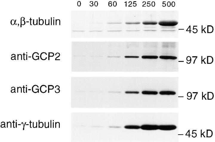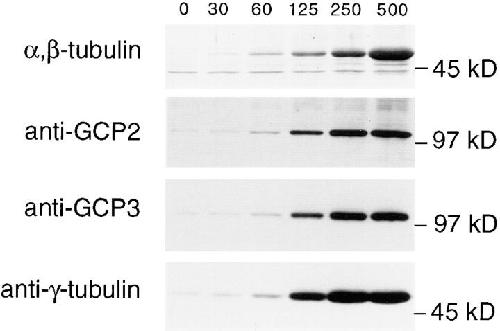 Figure 10. GCP2 and GCP3 associate with microtubules. Equal amounts of cytoplasmic lysate from A31 cells were incubated with varying concentrations of taxol-stabilized microtubules (0– 500 pM microtubules). The highest concentration of microtubules was approximately equal to the predicted concentration of γ-tubulin complexes in these lysates. The samples were centrifuged to sediment microtubules and associated proteins. The pellets were then stained with Coomassie blue to visualize α- and β-tubulin, and immunoblotted with anti-hGCP2, anti-hGCP3, and anti–γ-tubulin antibodies. The positions of the 97- and 45-kD molecular weight markers are indicated.