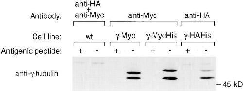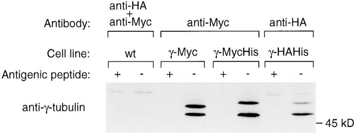Figure 3. There are multiple γ-tubulin molecules in the γ-tubulin complex. Epitope-tagged γ-tubulin was immunoprecipitated from cytoplasmic extracts of the indicated cell lines in the presence and absence of antigenic peptide. These immunoprecipitates were analyzed on a 7.5% SDS–polyacrylamide gel, transferred to nitrocellulose, and then immunoblotted with anti–γ-tubulin antibodies. The migration of a 45-kD molecular weight marker is indicated.