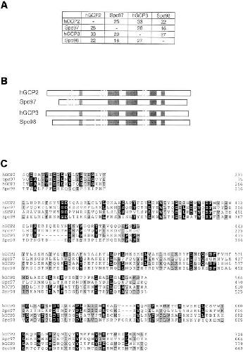 Figure 4. hGCP3, Spc98p, hGCP2, and Spc97p are related proteins. (A) Pair-wise comparison of hGCP2, Spc97p, hGCP3, and Spc98p. The numbers represent the percent similarity using the following groupings of amino acids: N and Q; R and K; S and T; D and E; Y, F, and W; I, L, M, and V; H; P; C; G; and A. (B) A schematic diagram of the hGCP2, Spc97p, hGCP3, and Spc98p proteins. The boxes representing the proteins are drawn to scale, with the dashed segments representing gaps of 10 amino acids or more that were introduced to align the proteins. The shaded regions represent regions that show significant homology. (C) The amino acid sequences of the shaded regions of homology indicated in (B). Amino acid positions that are either identical (black shading) or similar (gray) in at least three of the proteins are indicated. These sequence data are available from GenBank/ EMBL/DDBJ under accession numbers AF042379 (hGCP2) and AF042378 (hGCP3).