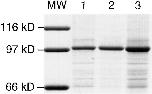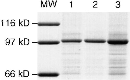 Figure 8. hGCP2 and hGCP3 migrate with the same electrophoretic mobility as the 100-, 101-kD doublet of the γ-tubulin complex. hGCP2 and hGCP3 were produced in insect cells using the baculovirus system. hGCP2 and hGCP3 were purified as insoluble proteins and analyzed on a 7.5% SDS–polyacrylamide gel, as follows: MW, molecular weight markers; 1, hGCP2; 2, hGCP3; and 3, hGCP2 plus hGCP3. The gel was stained with Coomassie blue to visualize the proteins. The molecular weights of the markers are indicated.