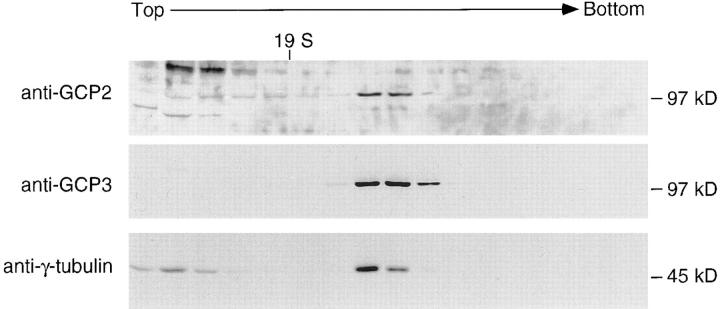 Figure 6. GCP2 and GCP3 cosediment with γ-tubulin in sucrose gradients. The sedimentation velocity of cytoplasmic γ-tubulin, GCP2, and GCP3 from human 293 cells was examined by sucrose gradient velocity sedimentation. Gradient fractions were immunoblotted with either anti–γ-tubulin, anti-hGCP2, or anti-hGCP3 antibodies. The position of thyroglobulin (19S) in a gradient run in parallel is indicated, as is the migration of the 45- and 97-kD molecular weight markers.
