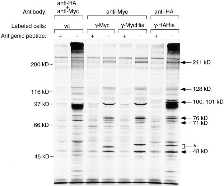 Figure 2. The composition of the mouse γ-tubulin complex. A31 (wt), and A31-derived cell lines expressing γ-tubulinMyc, γ-tubulinMycHis, and γ-tubulinHAHis were metabolically labeled with [35S]methionine and [35S]cysteine. Cytoplasmic extracts from these cells were sedimented through sucrose gradients and the epitope-tagged γ-tubulins were immunoprecipitated from fractions containing the γ-tubulin complex with the indicated antibody in the presence (+) or absence (−) of competing antigenic peptide. The resulting immunoprecipitates were analyzed on 7.5% SDS–polyacrylamide gel and visualized by fluorography. Molecular weight markers are indicated on the left. The arrows and numbers on the right indicate the position and calculated molecular weight of proteins that specifically coimmunoprecipitate with γ-tubulin. The position of the epitope-tagged γ-tubulins is indicated by the asterisk. The migration of the 100-, 101-kD doublet is altered when the anti-Myc antibody is used because the heavy chains of this antibody migrate at ∼100 kD (see Materials and Methods).