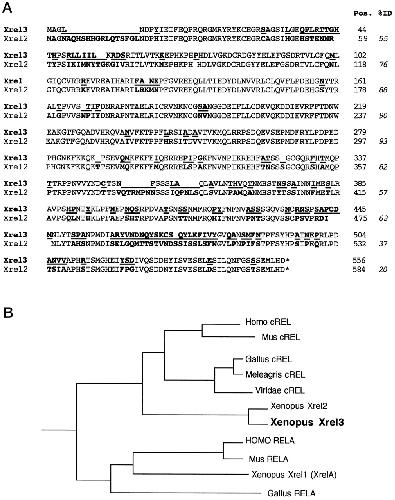 The Rel family of transcriptional activators form a large diverse group of proteins that are involved in the activation of genes involved in immunity, development, apoptosis and cancer. So far, none of the rel genes cloned in mammals appear to be required for embryonic development. We have cloned and characterized a cDNA from an embryonic cDNA library that encodes a novel Xenopus Rel protein, called Xrel3. Xrel3 is a member of the cRel subfamily and is most closely related to but distinct from other Xenopus Rel members. The expression of Xrel3 mRNA was investigated using Northern analysis, RNase protection assay, reverse transcriptase-linked polymerase chain reaction and in situ hybridization. Messages are present maternally and are slightly enriched in the equatorial region of the blastula stage embryo. At gastrulation, the accumulation of Xrel3 messages declines to undetectable levels but then increases after neurulation. In situ RNA hybridization was used to determine the spatial location of Xrel3 messenger RNA in embryos. Messages are localized to the developing forebrain, dorsal mid-hindbrain region, the inner earprimordium, or otocyst, and in the notochord. Overexpression by microinjection of Xrel3 RNA induced tumors in the developing embryo that appeared after gastrulation. The location of the tumors depended on the location of the injection site. These results suggest that Xrel3 might have a generalized role in regulation of cell differentiation in the embryo.
