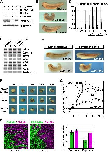 (B and C) XGAP-Mo causes gastrulation defects. The external appearance was examined at stage 35 ([B] and [C]; n = 120, gray and black indicate a short trunk and spina bifida, respectively). The gastrulation-defective phenotypes caused by the Mo were partially rescued by the coinjection of resXGAP (100 pg, 200 pg) in a dose-dependent fashion (C). In the absence of XGAP-Mo, resXGAP manifested the effects of XGAP overexpression, consistent with our initial observation (C).