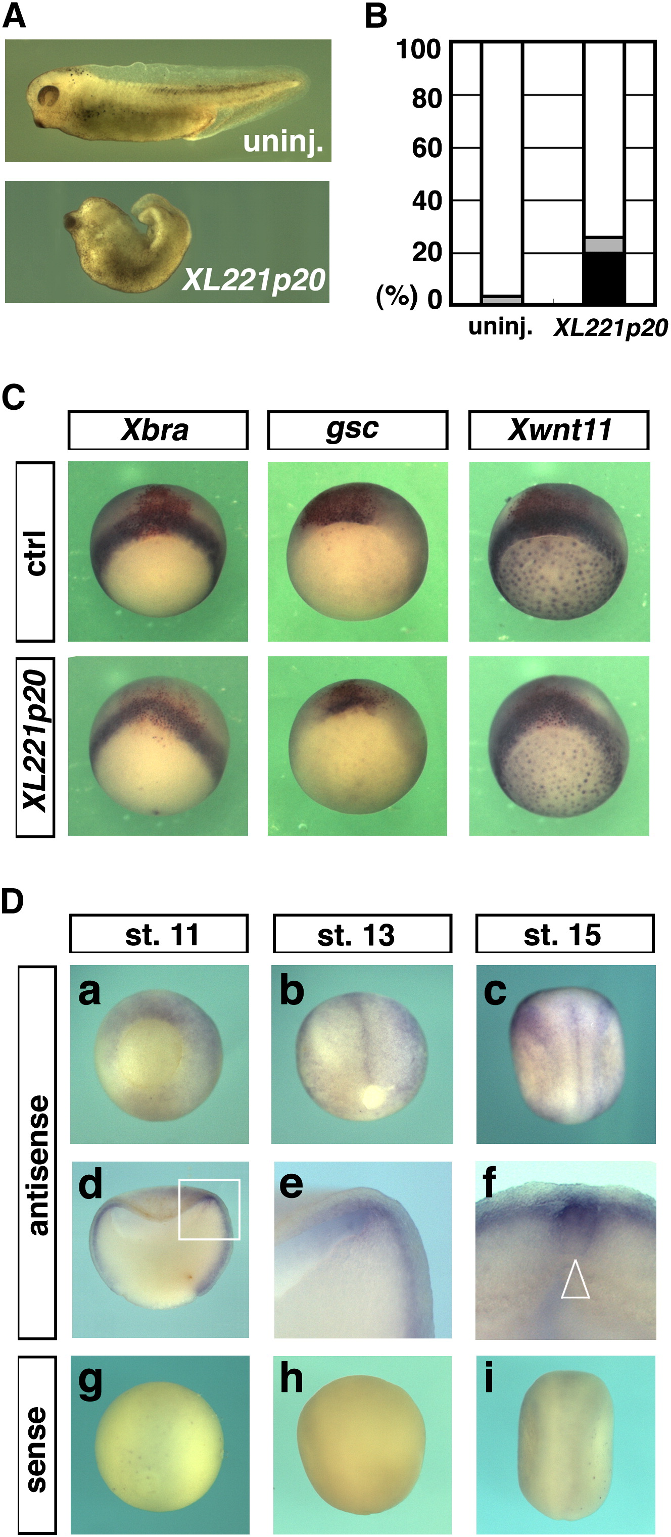 (A and B) Overexpression of XL221p20 causes gastrulation defects. The percentages of normal (open), short trunk (shaded), and spina bifida (solid) embryos are indicated in (B) (n = 60).
