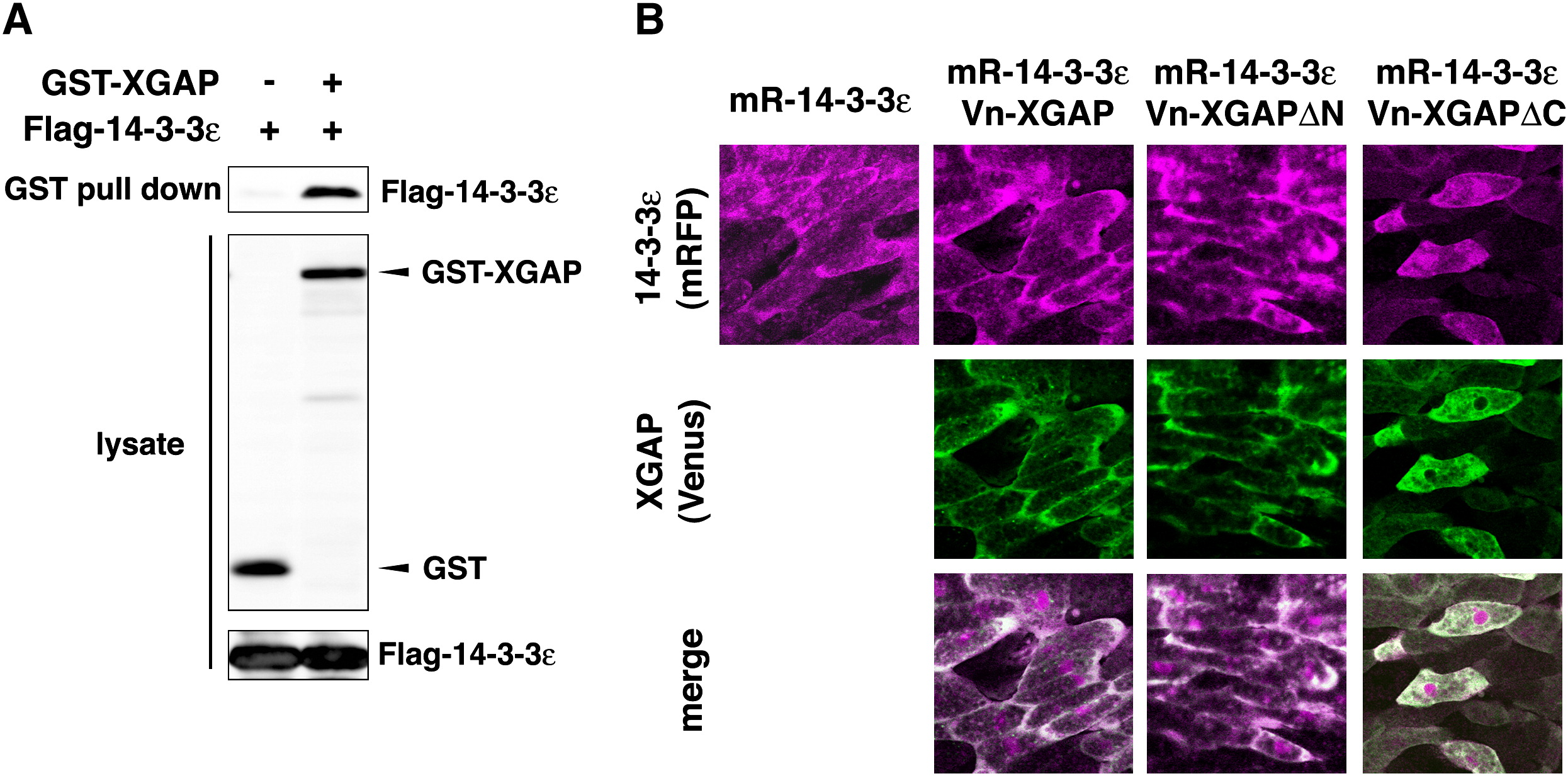 (B) XGAP directs the localization of 14-3-3É through XGAP's C-terminal region. The mRNA of mRFP-tagged 14-3-3É with or without the mRNA of each truncated construct of Venus-tagged XGAP was coexpressed in the DMZ. |