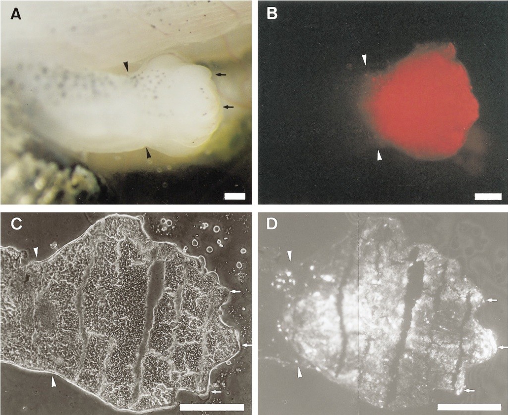 FIG. 2. PKH-26-labeled recombinant limb made from stage 51 mesenchyme. (A and B) Whole-mount preparation of a recombinant limb. (C and D) Cryosection of the same recombinant limb. (A and C) In ordinary light. (B and D) In fluorescent light. 18 days after operation. Small arrows indicate protrusions which later form digits. Note that the protrusion-forming regions are of graft origin. Bars, 250 mm.