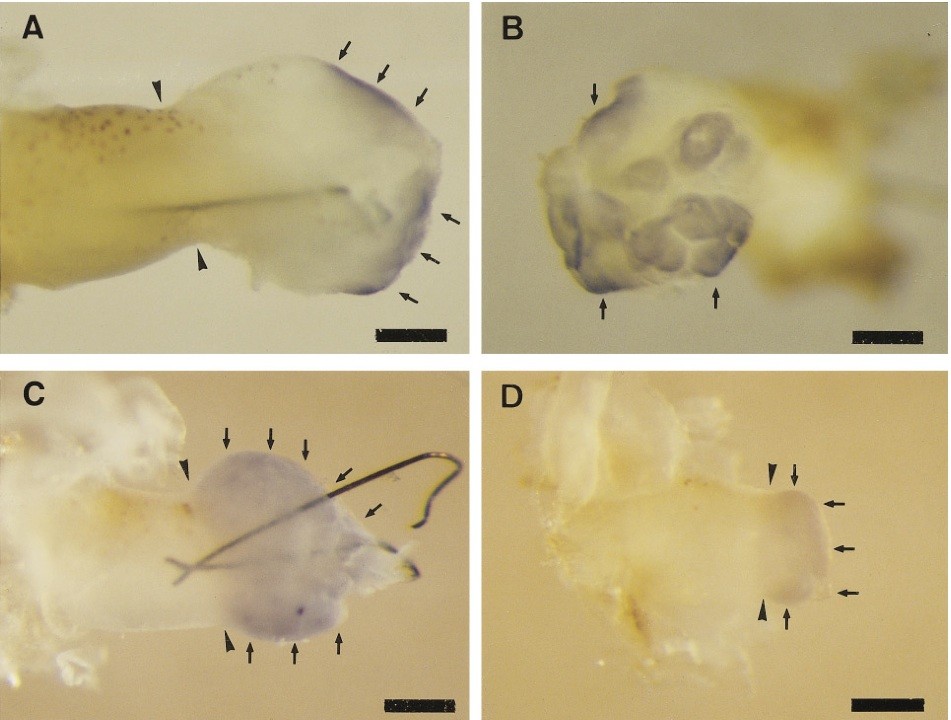 FIG. 3. Whole-mount in situ hybridization of fgf-8 (A) and shh (C) in recombinant limbs. (A) Dorsal view of the recombinant made from stage 56 mesenchyme showing that fgf-8 expression is restricted in the distal region of the recombinant. (B) Frontal view of the same recombinant as in (A), showing that there are multiple separate expression domains in the recombinant. (C) Dorsal view of the recombinant made from stage 52 mesenchyme showing widespread distribution of shh. (D) Dorsal view of the recombinant made from stage 56 mesenchyme showing shh expression in whole recombinants. Arrowheads show the hostraft boundary. Bars, 250 um.