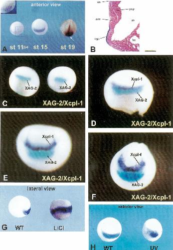 hybridization showing the localization of XAG-2 RNA during various developmental stages as well as in LiCl and UV-treated embryos (G). (A) XAG-2