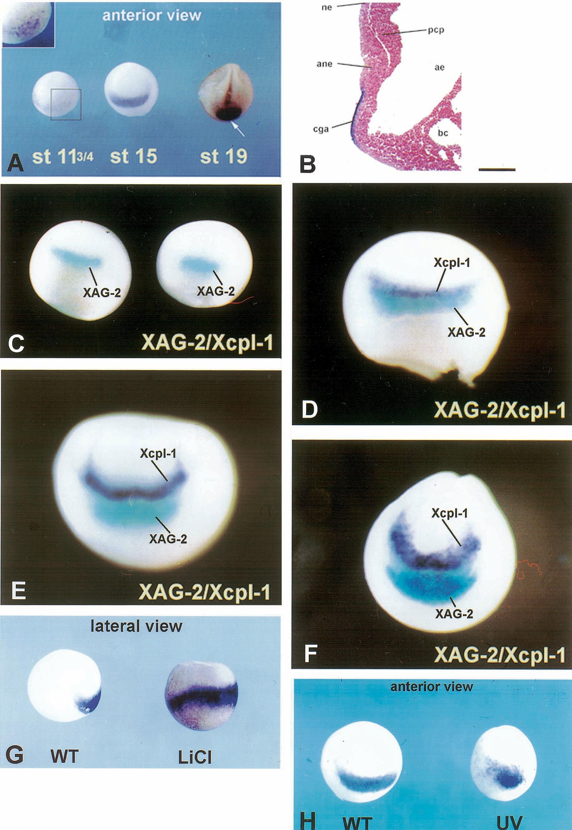 gland anlage and Xcpl-1 highlighting the anterior neural ridge. (G) Transcription of XAG-2 is enhanced by LiCl-treatment. Lateral view of early neurula